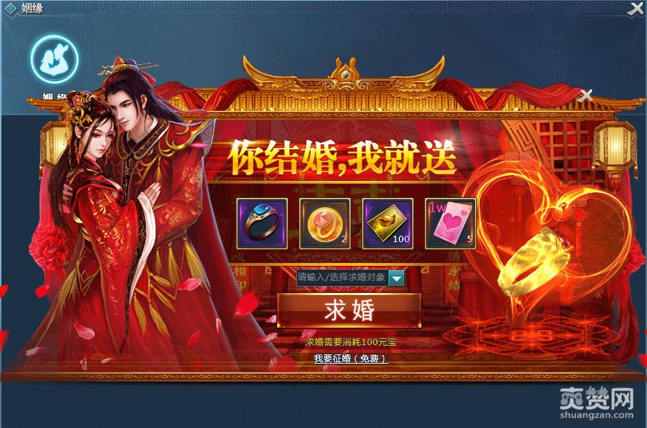花费100元宝就可以进行求婚,对方同意之后便可以结为夫妻,同时获得结婚戒指一枚;征婚则免费。