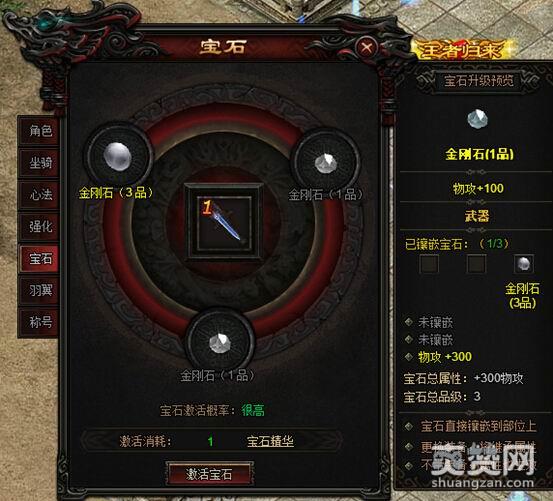 选择一件需要激活宝石的装备,点击“激活”按钮即可。激活宝石时需要消耗宝石精华。每个装备部位只可激活3颗,宝石激活后为一品。