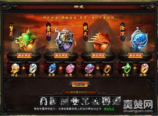 和一般游戏不一样的是,皓月屠龙神戒无需占用普通戒指位,可独立佩戴大幅提升自身属性,并获得逆天的特殊效果:而这些逆天特殊戒指,日常通过日常活动或者击杀BOSS收集获得,并进行升级!当神戒达到6级还能合成顶级神戒拥有两种戒子的专属属性,是不是很酷炫!