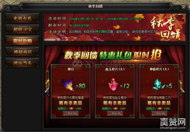 蓝月传奇限时抢购活动一般不会单独出现,它会随着一些特定活动出现,因此抢购的截止时间将在活动开始到结束期间进行。在限时抢购活动中,玩家可以在抢购栏中购买大批神羽、威望令、轮回丹和各类碎片等极品材料。平时不菲的价格在这里只需超低价格就能带回家,帮助玩家迅速提升实力。