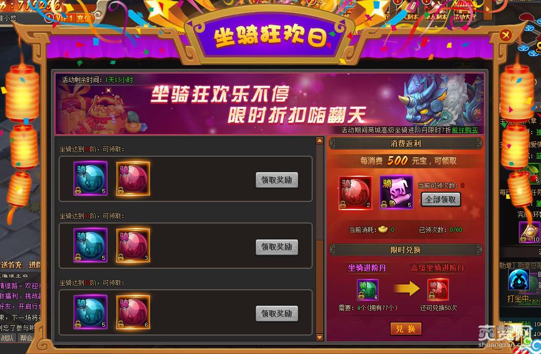 在消费返利活动中,玩家们每消费500元宝,即可领取2枚高级进阶丹与5张坐骑装备经验券。如果你的坐骑达到了10阶以上,刚好就可以借此机会将低级的进阶丹转化为高级进阶丹,更好的提升坐骑阶层,大幅提高角色属性哦!