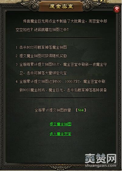 传说中魔金密室是一个由魔金巨龙用点金术制造的密室,玩家可击杀boss拾取魔金拼图,再通过提交一定数量的魔金拼图,刷新魔金守卫,击杀魔金守卫后即可拾取守卫掉落的大量绑元。