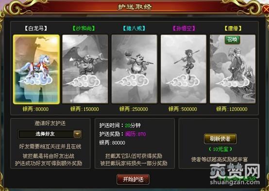 护送成功会获得银两和阅历奖励,帮助好友也可获得一定量的银两和阅历。拦截护送队伍可获得额外奖励,同样的被拦截会损失一部分奖励。另外,快马加鞭(可以缩短1/4路程)和筋斗云(可以立即完成)可大大提高取经使者的速度。