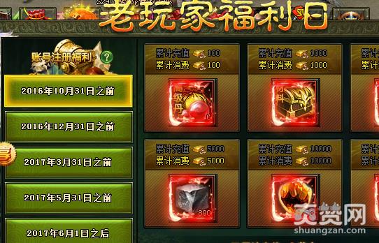 活动时间是从6月23日开始,6月27日终止,根据玩家游戏账号的创建时间,将玩家分为以下5档。其中,在2016年10月31日的玩家福利可谓是空前的令人眼红,各位玩家只需要在游戏内分别充值和消费100、1000、2000、5000、10000和20000黄金就能获得包括宝石精魄在内的游戏绝世稀有奖励。