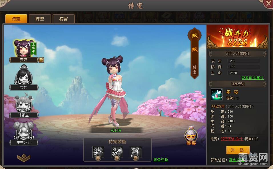 首先,在游戏中我们可以选择不同的侍宠。每个侍宠都有自己特有的属性和技能,技能类型和属性值都在侍宠界面右下角显示。以侍宠双双为例,双双的技能为【乖巧】,3级的【乖巧】可以为玩家增加攻击240,防御168,生命2400,闪避24,韧性24。其他的侍宠还有柔妹,宁宁公主等都有自己的属性值,并且这些属性值还会随着侍宠级别上升增加。