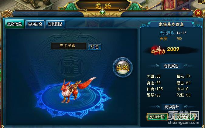 游戏中,在做主线任务到达一定等级后就会自动获得第一个一级一阶的小狐狸,每升一阶宠物都会变换样子。宠物的等阶越高,宠物的外形越呆萌、可爱、霸气。在游戏中可以击杀BOSS、做副本,在商城中购买宠物进阶丹和强化宠物资质的道具来给宝宝强化。从凡品到神品,从1阶到12阶。资质越高等阶越高,给玩家自身的属性和战力加成越高。