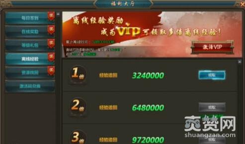 玩家离线后,系统会自动累计玩家的离线时间,根据玩家离线的时长,在玩家重新登陆后可一次性领取到离线的累计经验,成为VIP后更可领取到多倍的离线经验。