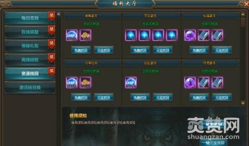 玩家前一天如果有遗忘的副本或任务等,第二天都可通过资源找回领取到相应副本的经验以及奖励,免费找回可一次性找回之前漏掉副本的50%的奖励,消耗元宝可找回所有的副本奖励。