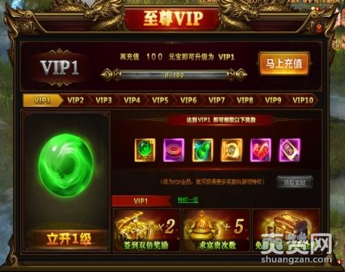 VIP1奖励:经验葫芦*1、星儿升级材料*20、皇陵地宫门票*1、世界BOSS门票*3、寻宝令*1、1W银两卡*10。