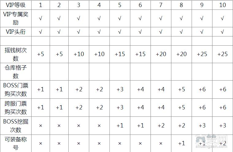 VIP10奖励:沙滩椅4*1、坐骑资质丹*1、骑兵资质丹*1、破月弩资质丹*1、单飞翼资质丹*1、跨服BOSS门票*3。