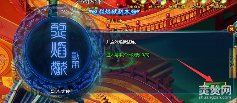 可以看到这里有几个NPC,我们找到上方标注着烈焰狱副本的NPC,点击NPC后会弹出副本界面。点击“进入副本”即可开始刷副本。