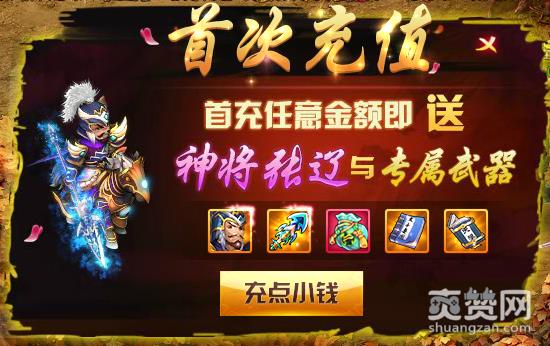 玩家们首次充值的话,可以获得下面这些东西:炎轮扇(星级:六星,+799攻击,+1420生命)、陆逊(品质:紫色武将)、炖鹅(可以加经验,除此之外还有技能书和天狼阵等等道具)