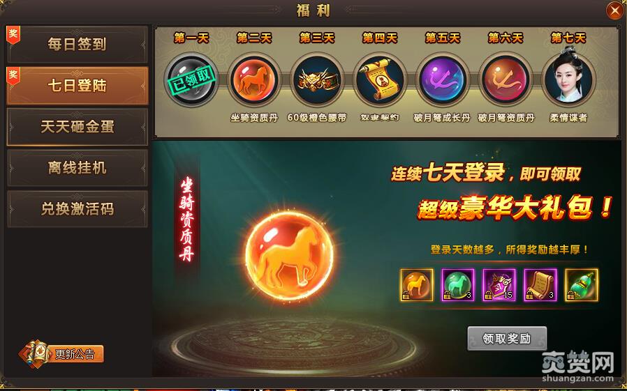 坐骑资质丹*1、坐骑进阶丹*3、护送令*15、挖掘灵符*3、经验葫芦*1