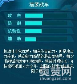 飞鹰战车:机动性非常优秀,但是防御能力脆弱,炮弹威力一般,每次射击将连续开火两次,每次开火发射两枚炮弹,填装时间中等。