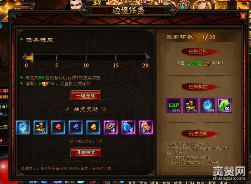 1、边境任务。边境任务算是经验类型的任务,也算是提升装备的任务。可以说是一箭双雕。在边境任务进行的过程当中,完成5轮任务就能够获得1次抽奖的机会。每天完成20轮之后就没有办法继续做下去了。除了经验值,边境任务带给我们是大量的强化道具、真气值以及金币。