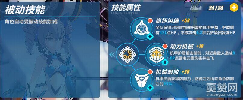 4、被动技能:被动技能中的崩坏纠缠是山吹的核心技能,它可以在一定时间内不受攻击时制造一个一定HP的护盾,并且护盾不破,女武神攻击就不会被打断,这是防断连的神技,也可以为脆皮的女武神提升生存能力。机械吸收就更厉害了,护盾可以获得防御力,最高可以获得山吹防御力的100%,也就是说山吹的防御力越高,盾就越厚,由于这个技能的存在,山吹也被分成了2个流派,一是堆防御的辅助流,二是输出流山吹。