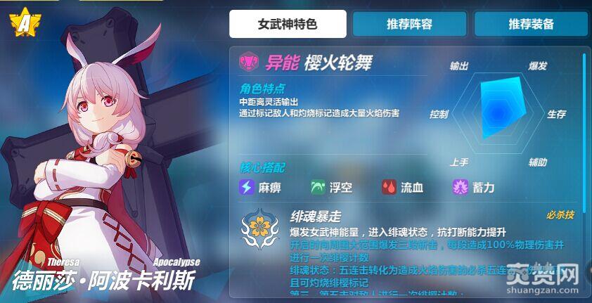 今天小编要为大家介绍的是最近崩坏3rd1.6版本新出的女武神,德莉莎 阿波卡利斯 樱火轮舞(外号火傻),听名字就不难看出,樱火轮舞的主要输出应该是火属性伤害。小编欧气爆发,在扩充补给中也抽到了樱火轮舞,试玩后也确实是这样,火元素伤害贼高。