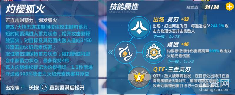 灼樱狐火,这个技能的主要在于对于有绯樱标记的怪物,在蓄力后释放狐火,将怪物身上的绯樱标记转为灼樱标记,在1.2秒后造成爆炸并伴有高倍伤害及浮空状态。这个技能就是樱火轮舞的主要输出技能。