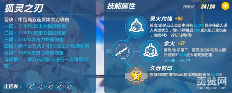 狐灵之刃,这个技能呢主要是为了给怪物上绯樱标记,以及会有额外的火元素伤害,普攻的第三下与第五下会计算一次绯樱计数,也就是说在第二个第三下攻击就能够给怪物套上一个绯樱标记了,绯樱标记与八重樱 巫女的绯樱标记是通用的,互相可以触发灼樱技能和刃返技能。