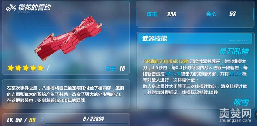 关于武器的话,樱火轮舞的武器非樱花的誓约不可,毕竟不管是从名字上还是从外观上看,这都是樱火轮舞的标准毕业武器,武器主动技能“灵刀乱神”能对怪物进行快速斩击,并且有几率进行一次绯樱计数,被动技能吹雪有59.9%概率对周围释放圆形樱花斩,造成伤害,并且如果是樱火轮舞装备的话还能增加 一次绯樱计数。