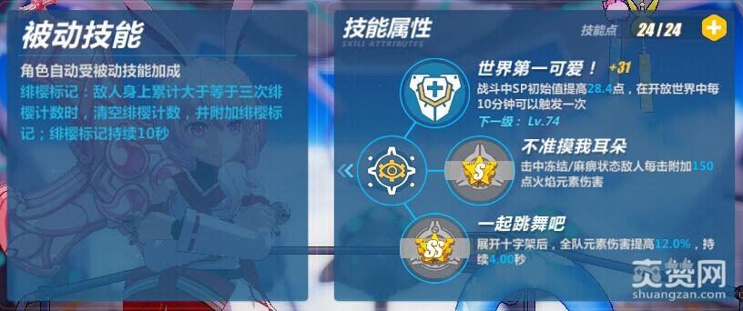 被动技能,关于“世界第一可爱”这个技能,小编觉得有点像鬼铠的队长技能,不过樱火轮舞的这个技能不需要作为队长才有效果,“不准摸我耳朵”这个技能如果能配合游侠聚怪然后雪地开大,再切换樱火轮舞开大后输出的话,小编觉得那画面一定很美。“一起跳舞吧”这个技能从解释上来看就是增加樱火轮舞自身元素伤害的一个技能。