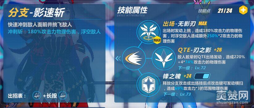 分支—影速斩:分支攻击是影舞的主要攻击方式,影舞基本不使用平A,所以,A级的影舞在没有点出锋之魄的时候攻击会比较乏力,在S级点出 锋之魄后,攻击力会有一个明显的提升。对于QTE刃之影,舰长们基本可以忽视这个QTE技能,基本没什么伤害,效果也不好 。