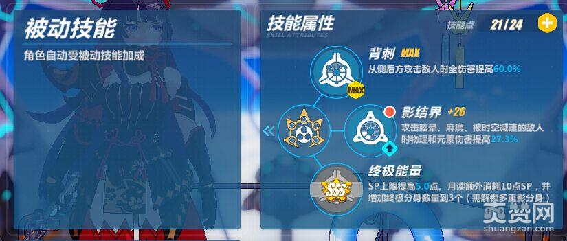 被动技能:被动技能中背刺是一个效果很好的技能,不过也是影舞在使用技巧上的一个难点,如何用闪避转到敌人身后在用分支攻击,是每一个影舞玩家们所必须掌握的技能。影结界的话能够使得在眩晕、麻痹、时空减速下的敌人收到全伤害增加。终极能量则是增加一个大招的分身。