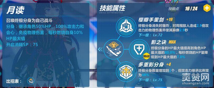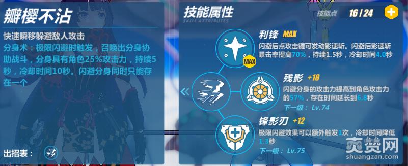 瓣樱不沾:影舞的闪避技能,闪避成功能召唤出一个分身,当达到S级时,点出锋影刃,能额外触发一个分身。