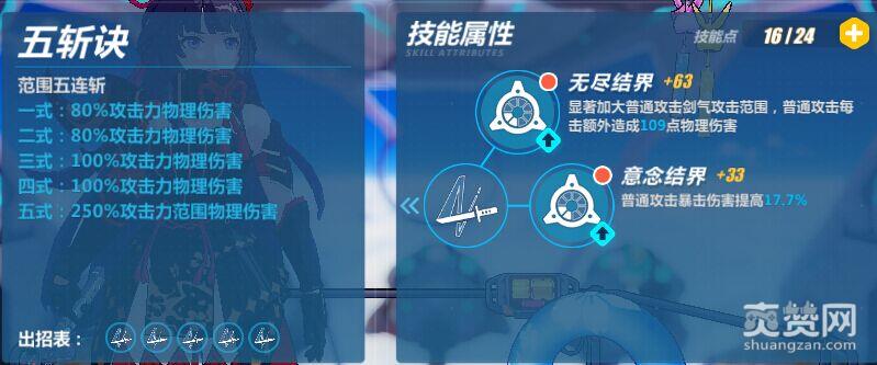 五斩诀:影舞的普通攻击,这个技能其时对影舞没什么用,因为影舞基本只存在使用分支攻击这么一个情况,可以把普通攻击无视了。