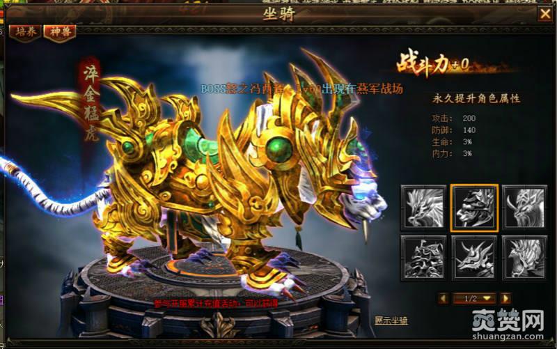2、 淬金猛虎。参与开服累计充值的活动就可以获得。永久增加200的攻击和140的防御。提高3%的生命力和内力。