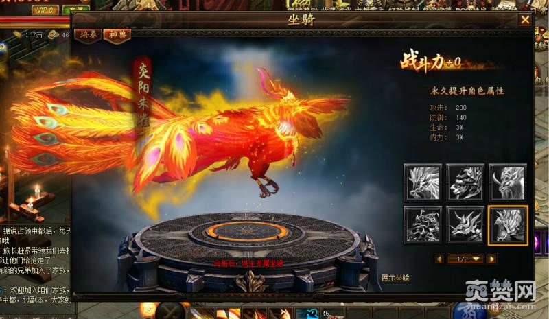 6、 炎阳朱雀。合服之后,成为城主,专属坐骑就是它。永久提升200的攻击力和140的防御。增加3%的生命和内力。