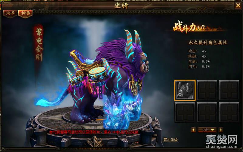 7、 紫电金刚。在玩家参与赛马活动之后会获得金刚的碎片,集齐100枚之后就可以兑换。提高45的攻击和防御。增加0.5%的生命和内力。