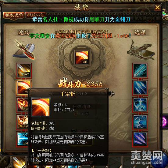 2、 千军斩。按照套路分析,这是一个小型的aoe技能。Pve的时候刷怪非常的有用,建议主要升级这个技能。