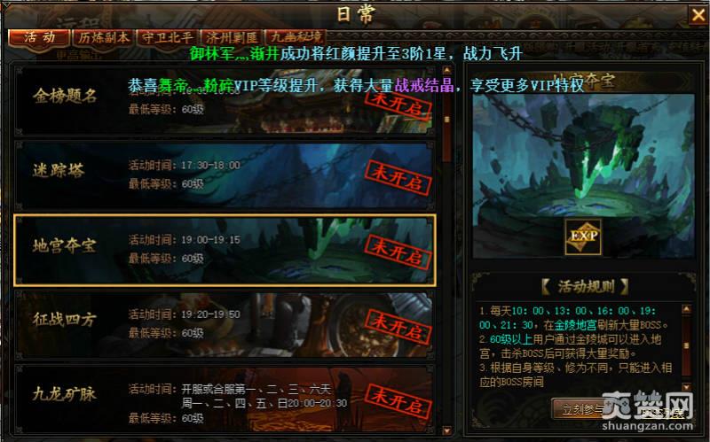 3、 地宫夺宝。这个任务是唯一能够获得海量经验的活动,每天的10:00、13:00、16:00、19:00、21:00在金陵地宫都会刷新大量的boss。只需要进入击杀boss之后,玩家就可以获得海量的经验啦。