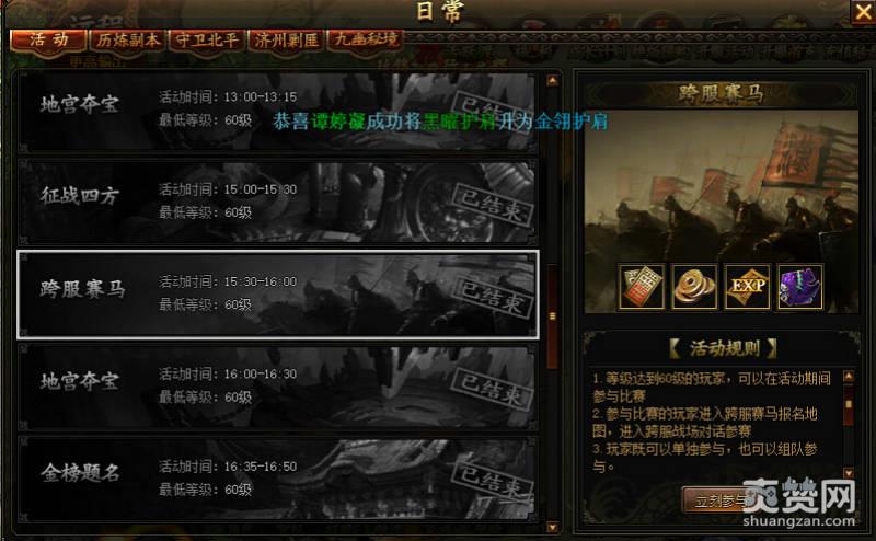 2、 跨服赛马。等级到了60级的玩家,就可以报名参加赛马活动了。无论是单独参加还是组队参加都是可以的。进入跨服的赛马的活动当中,只需要一个字,那就是快。够快才能够赢得胜利。除了一般的经验宝钞之外,赛马还会给紫电金刚的碎片,小编建议每一个平民玩家都去参加这个活动。毕竟紫电金刚还是非常好用的。
