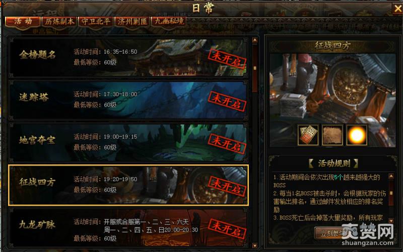 1、 征战四方。活动开放的时间是下午的3点到3点半。在这个活动当中,会出现越来越强大的boss。玩家只需要用吃奶的力气去打出最高的输出就可以了。每当一名boss死亡之后,系统就会统计那个boss的伤害排名,根据排名的多少回给予不同的奖励。当所有的boss被击杀了之后,所有的玩家都会收到宝钞、精元和图纸的奖励。
