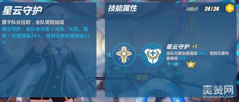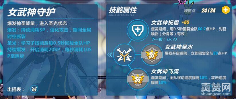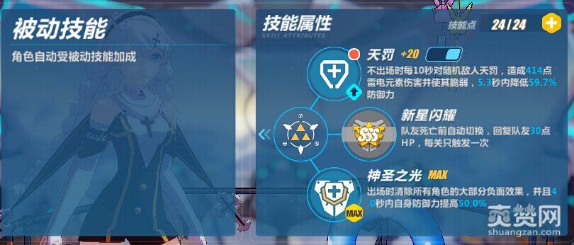 被动技能:天罚能在不出场的时候对敌人造成伤害,并加脆弱buss,很实用,新星闪耀,虽然小编还没有,但是看起来就知道很实用,保命的技能,切换后圣女开大马上救回来,神圣之光集清buff与增加防御于一体,也是很好用的技能。