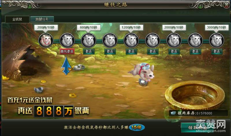 首先就是金钱鼠玩法,这也算是玩家最先接触到的银两玩法了,随着玩家在线时间的增加,金钱鼠也会产出大量的金钱,并且金钱鼠的数量越多,那么收益也就越高。这里小编建议,如果真的想要用金钱鼠获得大量的金钱,那么越早投入也就越划算。一只金钱鼠最高一天可以活的170多万两银两,最高的九只金钱鼠一天能够获得2592万银两,这些银两能够用来强化装备,提升技能,可以瞬间就转化成为玩家的战斗力。