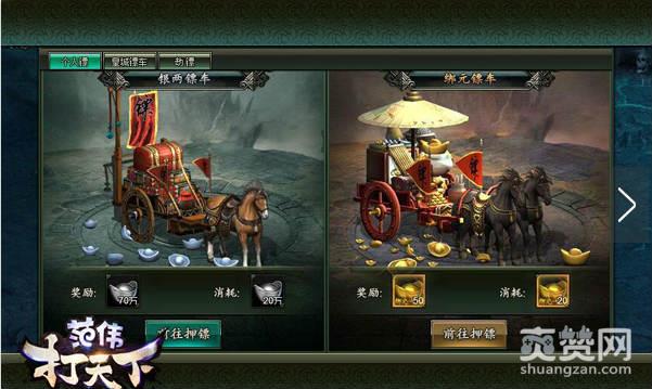 首先我们来了解一下在范伟打天下当中可以押送的两种镖车把。第一种是银两镖车,顾名思义就是押送完成的奖励是以银两的方式给予的,如果小伙伴们急于获得银两升级装备,那么这个方法是有效的。玩家需要以20万银两作为押金,如果押镖成功则获得70万银两,净赚50万。还有一种就是绑元镖车了,玩家使用20绑元作为押金,如果押镖成功则获得50绑元,净赚30绑元。在范伟打天下当中,绑元和元宝并差不多,所以如果银两够的话,小编建议还是押绑元镖车。当然在绑元的镖车有更高的几率被劫持,所以一定要谨慎的选择。