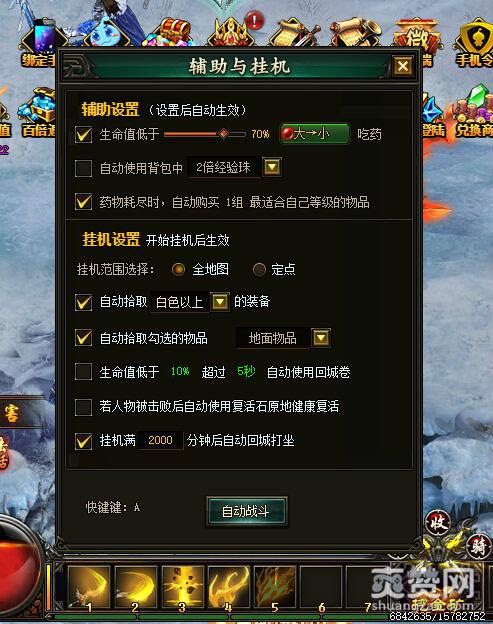 在挂机的设置当中,有辅助设置和挂机设置两个方面。辅助设置主要是针对于玩家的后勤工作的,可以调整玩家的血量低于一定值得时候,会使用药品。或者设置玩家的背包里面没有药水的话可以购买药水。