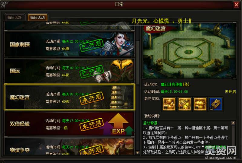 然后中午的时候就做一下膜拜。然后等下午三点半的迷宫开放。这个活动一定要参加,如果你们国家强盛的话,那就直接进到神秘层,等着打完猪猪捡钱就得了。如果你是弱势国家,我告诉你一个猥亵的方法,你到十层以后呆个4.5分钟然后进到神秘层,会直接扑街,但是不要担心,等到boss快死的时候站起来点自动就能有很多的礼金了。