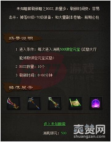 在游戏中,未知暗殿中主要会集中的刷新出暗之BOSS,10大高等级BOSS盘踞其中静等挑战,BOSS不仅数量众多,刷新时间也相当快,可以应付众多玩家们的挑战需求。成功击杀BOSS将会掉落不少玩家们梦寐以求的高等级装备与副本卷轴等,不容错过哦!但要注意的是,进入暗殿需要消耗500绑元,绑元能够通过奖励大厅、地下夺宝、炼狱迷宫等途径来获取到,量力而行会比较好~