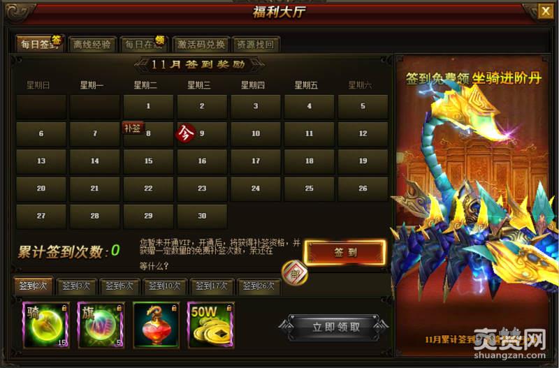首先要做的就是签到了。签到是很多小伙伴经常会忘记的事情,但是每天的签到奖励实际上是非常的丰厚的,所以玩家每天上线了之后就一定要领取。当然很多小伙伴没有那么多的时间花在游戏上面,我们如果有什么事情走开了,比如睡觉去了,那么一定把人物挂到一个合适的位置,挂机打怪才是不浪费每一秒的时间。