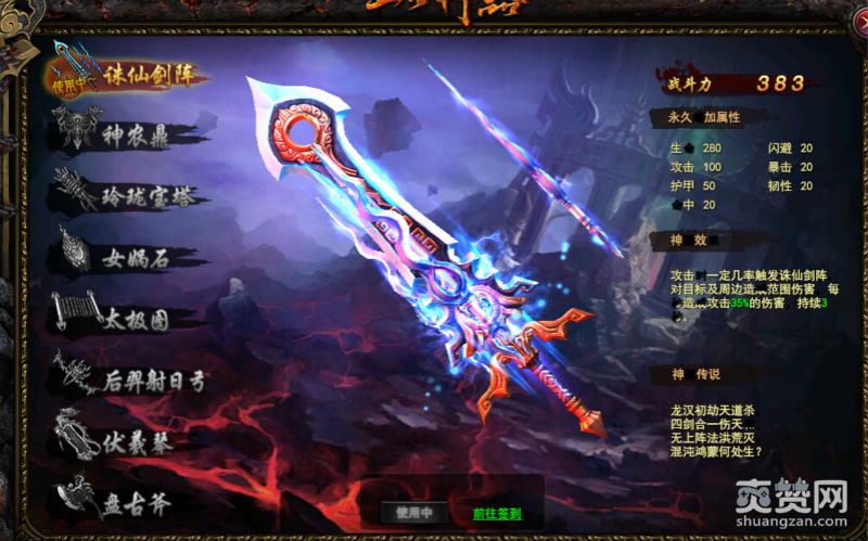 1、诛仙剑阵。只要在线一个小时就能够激活了。攻击的时候有一定的几率触发诛仙剑阵,对周围的怪物造成范围伤害。这是一个非常实用的技能,而且aoe技能在大战神中虽然比较多,但是攻击加成这样的还是比较少的。所以诛仙剑阵是玩家必须要入手的一个神器。