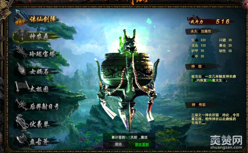 2、神农鼎。连续签到两天之后就能够获得。在被攻击的时候一定看几率会触发,最高可以触发20%的最大生命。