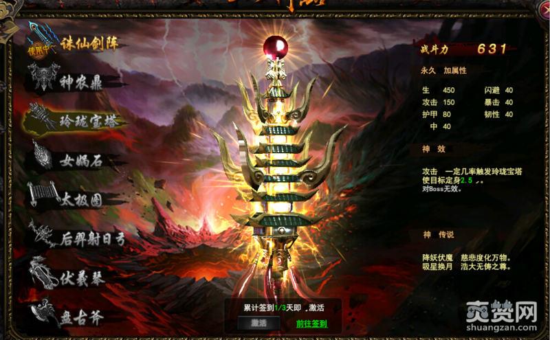 3、玲珑宝塔。累计签到三天可以获得。在攻击的时候有一定的几率定身。Pvp神技。