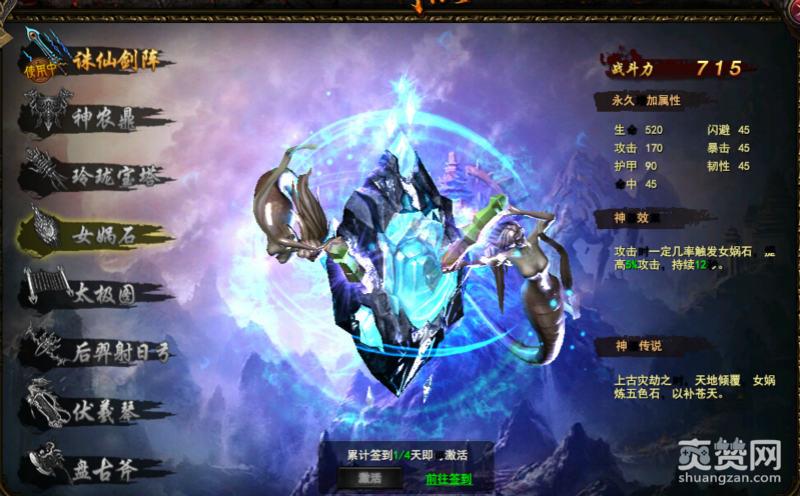 4、女娲石。累计签到四天的时候就可以获得。神器的效果是在攻击的时候能够提高自身的攻击力,小编测试了一下,几率还是非常好的。相当于自身的buff。
