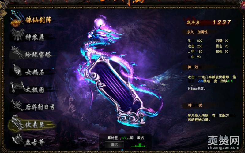 7、伏羲琴。连续签到7天可以获得。伤害的效果是偷取速度。走A神技,如果玩家对自己的走位有信心的话,那么还是可以用一下的。