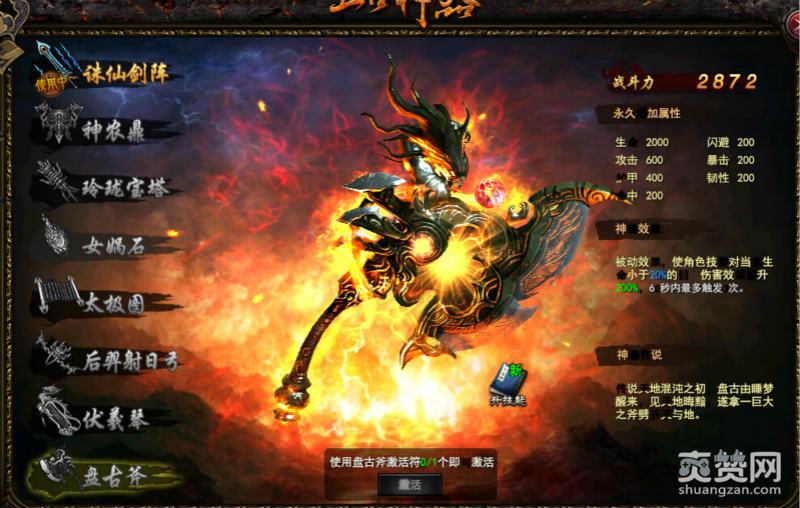 8、盘古斧。使用盘古斧激活符可以获得。最强的神器没有之一,一个斩杀的被动。在pve方面能够更快的收割。Pvp方面只要低于20%的血,几乎就是一刀斩了。