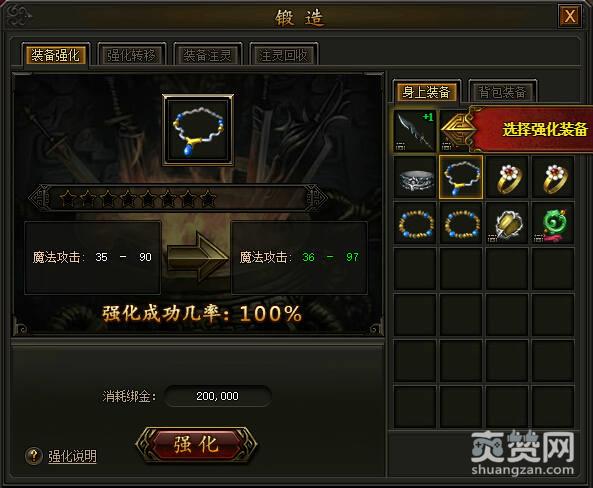 在强化装备的前期,实际上还是非常容易的,因为前期装备的强化还是几率很高的。不过等到装备的强化等级到了9以上的时候,这些装备就比较难以强化了。那么我们要做怎么样去强化呢。第一种办法就是不断的刷装备,刷到很多的60装-80装。是的你没有听错,没错,是很多很多,有的人都已经吃下经验了,那你没攒到如此多的装备的话。小编在这里提醒一个小办法,就是练几个道士的小号,作为单刷王的道士能够很快的刷boss掉落装备,这样就能够获得很多的装备了。